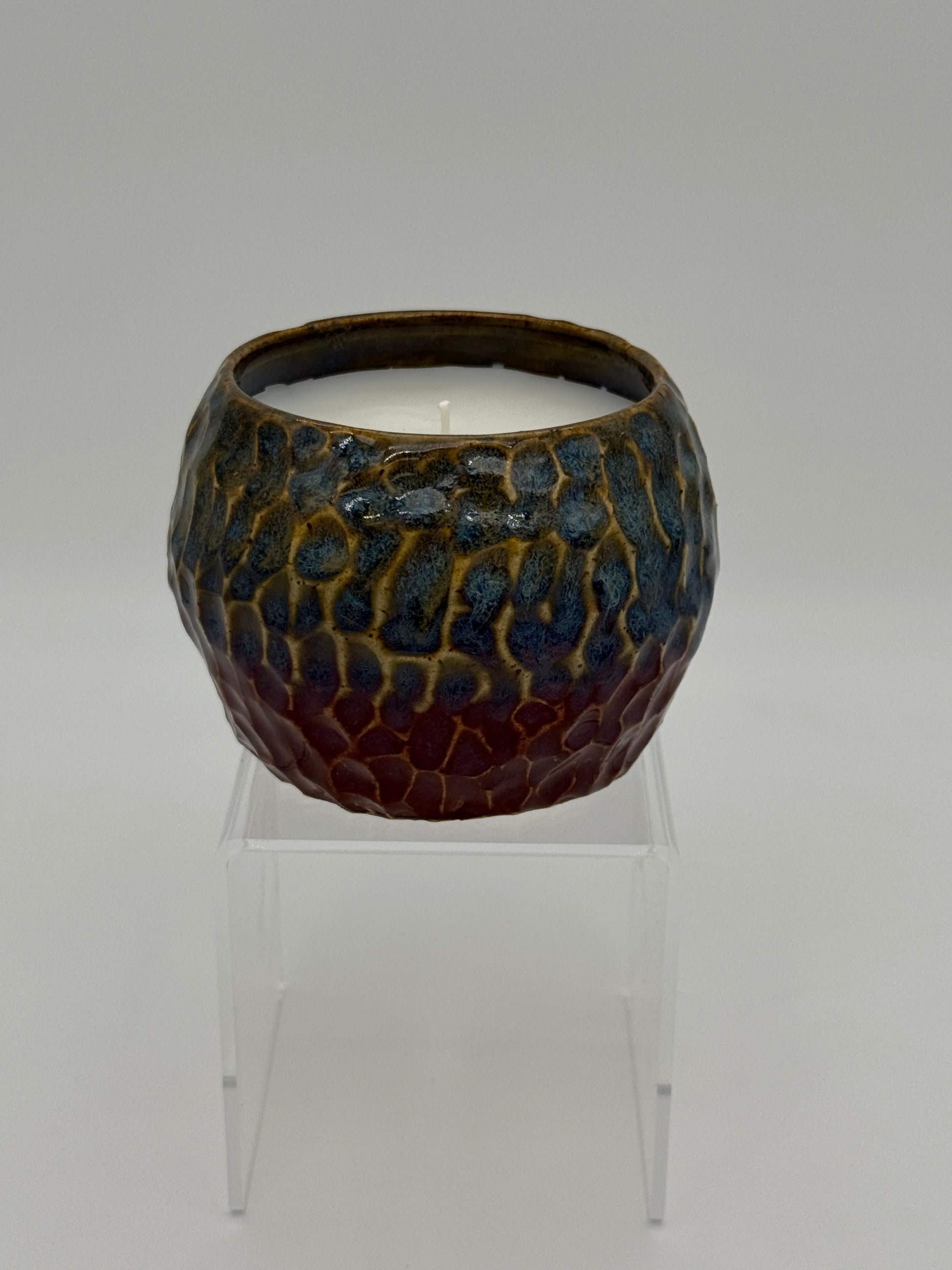 This handcrafted ceramic candle features a richly textured, faceted vessel with a dramatic crackle glaze that blends deep ocean blues, warm honey tones, and smoky crimson hues. The sculptural surface catches light beautifully, creating depth and movement even before the candle is lit. When glowing, the layered glazes and subtle translucence add warmth and ambiance, making it a striking statement piece for coffee tables, shelves, or bedside styling.